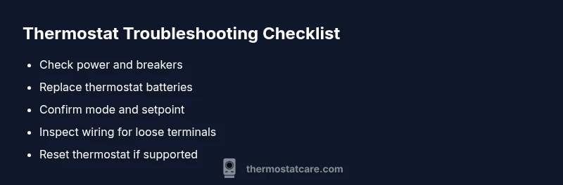 According to Thermostat Care, many off-conditions are caused by simple power or setting issues. When the display is dark or the screen is faint, the first steps are often the fastest path to restoration. Homeowners and DIYers should follow a clear sequence: confirm power, inspect batteries, and verify mode and setpoint before moving to wiring checks. This approach minimizes guesswork and reduces the risk of further faults.