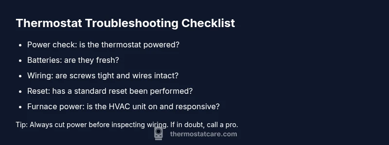 The Thermostat Care team emphasizes proactive maintenance and safe troubleshooting. Regular checks of power, battery health, and wiring reduce the odds of a mid-season outage. When you encounter complex fault codes or inconsistent cooling/heating, rely on professional diagnostics to protect your equipment and home comfort. Following these guidelines helps ensure your thermostat stays dependable year round.
