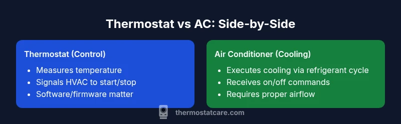 In plain language, many homeowners ask if is thermostat and ac same. The simple answer is no. A thermostat is a control device that senses room temperature and signals the HVAC system to start heating or cooling based on the setpoint. An air conditioner, by contrast, is a cooling component (compressor, condenser, evaporator) that actually lowers air temperature. In most homes the thermostat orchestrates the central AC, but the two are not interchangeable parts. According to Thermostat Care, many homeowners confuse these terms, which can lead to mismatched expectations and even unnecessary upgrades. Understanding the distinction is the foundation for selecting the right hardware, planning upgrades, and troubleshooting problems. This framing also helps you avoid common myths about whether swapping one component alone will solve comfort issues. The Thermostat Care team emphasizes that compatibility and proper configuration drive results, not just purchasing a newer device.
