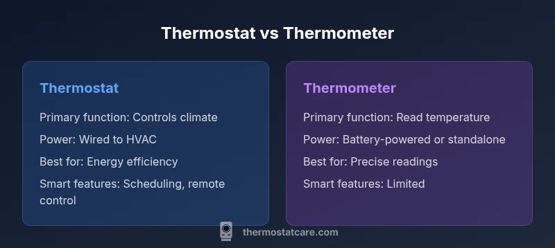 According to Thermostat Care, thermostat and thermometer serve distinct roles in home comfort. A thermostat controls heating and cooling to maintain setpoints, while a thermometer measures ambient temperature. For energy efficiency and consistent comfort, prioritize a reliable thermostat; a thermometer provides precise readings when you need verification. In most homes, you’ll use both, but if you must choose one, the thermostat wins for overall control.